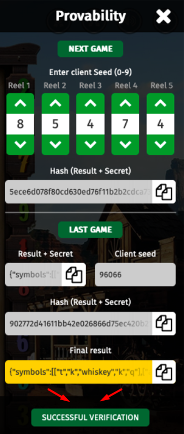 Now, you can use the Provably Fair checker to validate the transparency of a game. The system adds your client seed to the Result fingerprint and passes Result + Secret and unhashed final result to you. At this point, you can see that the outcome is genuine.