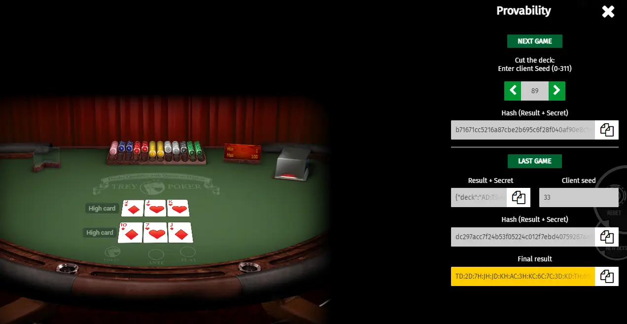 Provably Fair Poker is a true star among gamers. By comparing the Result+Hash seed with the final script, you can be sure that card shuffling is transparent. Mirax players have dozens of Provably Fair bitcoin Poker games to choose from: Casino Hold’em, Caribbean Poker, Oasis Poker, and many more.