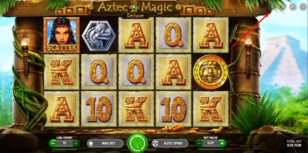 Open a game you want to play. We chose Aztec Magic Deluxe by BGaming. Click on the Provably Fair icon in the upper right corner as shown in the picture below.